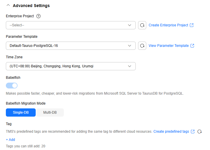 If your organization has configured tag policies for TaurusDB for PostgreSQL, add tags to DB instances based on the policies. If a tag does not comply with the policies, DB instance creation may fail. Contact your organization administrator to learn more about tag policies.