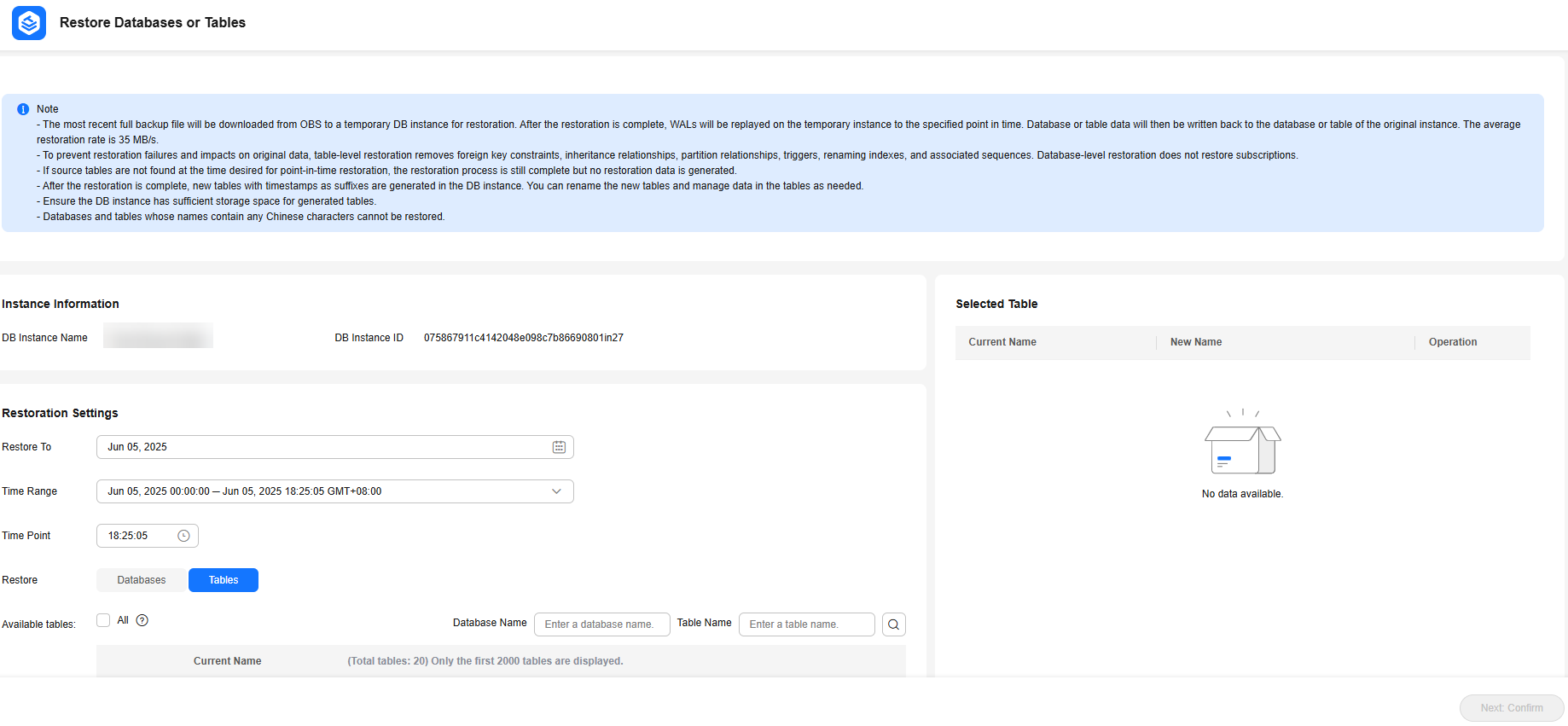 - During table restoration, a maximum of 20,000 tables can be restored for one instance at a time. If the number of tables to be restored exceeds 20,000, you can restore the entire instance using PITR. For details, see Restoring a DB Instance to a Point in Time.