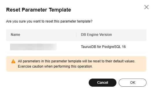 in the upper left corner of the page and choose Databases > TaurusDB. - On the Parameter Templates page, click Custom Templates. Locate the target parameter template and choose More > Reset in the Operation column.