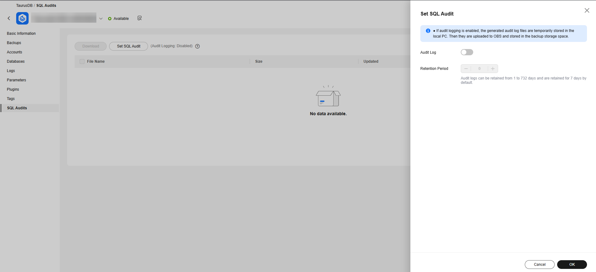 - In the displayed dialog box, toggle on the audit log switch and set the number of days to retain audit logs.