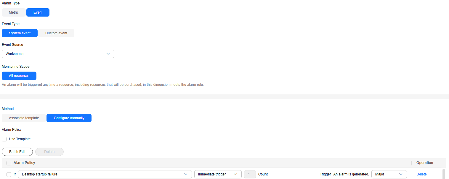 - If you select Event for Alarm Type, you can create alarm rules by referring to Cloud Eye Events Supported by Workspace, as shown in Figure 2.