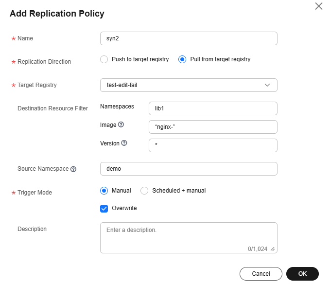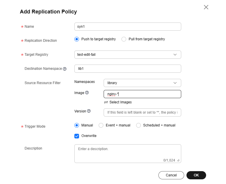 Pull all images starting with nginx-in from the lib1 namespace of the target repository test-edit-fail to the library1 namespace of the local repository. The replication needs to be triggered manually and images with the same name will be overwritten.