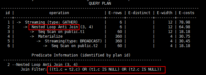 nestloop anti join must be used to implement NOT IN, while you can use Hash anti join to implement NOT EXISTS. If no NULL value exists in the JOIN column, NOT IN is equivalent to NOT EXISTS. Therefore, if you are sure that no NULL value exists, you can convert NOT IN to NOT EXISTS to generate hash joins and to improve the query performance.