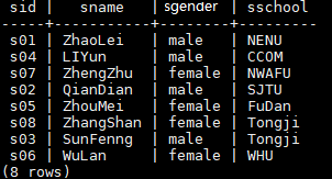 INSERT INTO student VALUES('s01' , 'ZhaoLei' , 'male', 'NENU'); INSERT INTO student VALUES('s02' , 'QianDian' , 'male', 'SJTU'); INSERT INTO student VALUES('s03' , 'SunFenng' , 'male', 'Tongji'); INSERT INTO student VALUES('s04' , 'LIYun' , 'male', 'CCOM'); INSERT INTO student VALUES('s05' , 'ZhouMei' , 'female', 'FuDan'); INSERT INTO student VALUES('s06' , 'WuLan' , 'female', 'WHU'); INSERT INTO student VALUES('s07' , 'ZhengZhu' , 'female', 'NWAFU'); INSERT INTO student VALUES('s08' , 'ZhangShan' , 'female', 'Tongji');