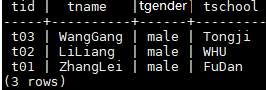 INSERT INTO teacher VALUES('t01' , 'ZhangLei', 'male', 'FuDan'); INSERT INTO teacher VALUES('t02' , 'LiLiang', 'male', 'WHU'); INSERT INTO teacher VALUES('t03' , 'WangGang', 'male', 'Tongji');