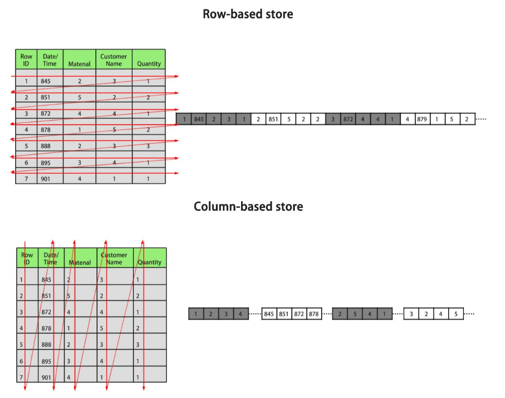 In the preceding figure, the upper left part is a row-store table, and the upper right part shows how the row-store table is stored on a disk; the lower left part is a column-store table, and the lower right part shows how the column-store table is stored on a disk.