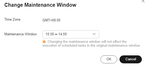 The default maintenance window is 10:00–14:00 (GMT+08:00) but you can change it if needed. To prevent service interruption, set the maintenance window to off-peak hours. Before calling this API:
