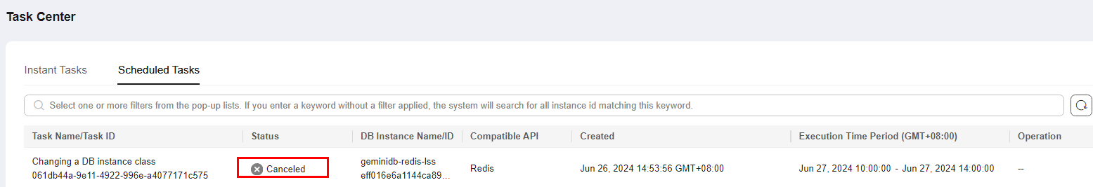 On the Task Center page, you can view the result. After the task is cancelled, its status changes to Cancelled.