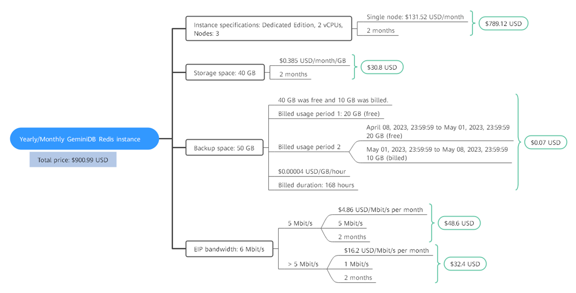 Assume that you bought a three-node dedicated GeminiDB Redis instance with 2 vCPUs, 40 GB of storage, 50 GB (40 GB for free) of backup storage for one month at 15:50:04 on March 8, 2023 and renewed the subscription for one more month before it expired. The billing items include instance specifications (vCPUs, memory, and nodes), storage, backup storage, and EIP bandwidth.
