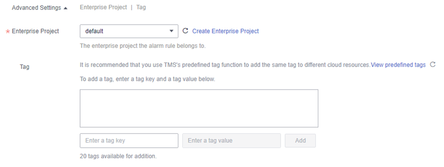 A tag is a key-value pair. Tags identify cloud resources so that you can easily categorize and search for your resources. You are advised to create predefined tags on TMS. For details about how to create predefined tags, see Creating Predefined Tags.