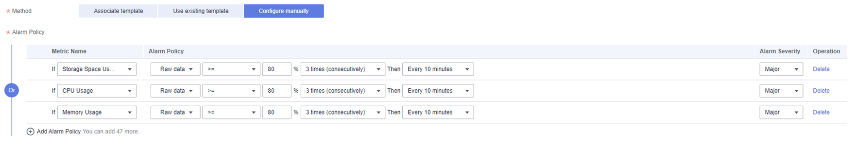 A maximum of 50 alarm policies can be added to an alarm rule. If any one of these alarm policies is met, an alarm is triggered.