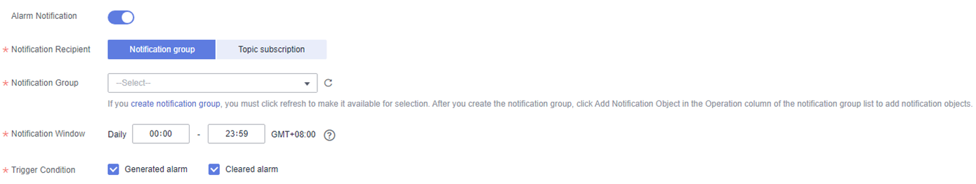 For example, if Notification Window is set to 00:00-8:00, Cloud Eye sends notifications only within 00:00-08:00.
