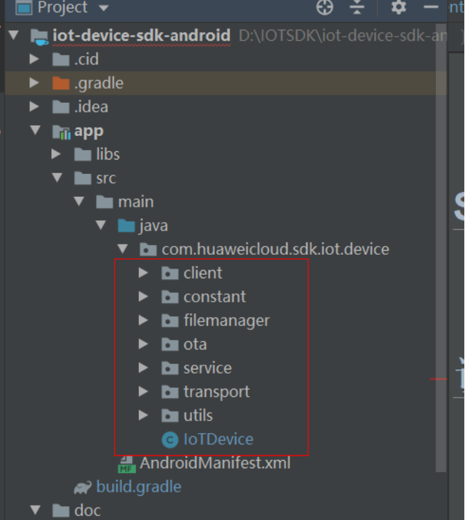 - Copy the Java source code of the iot-device-sdk-android project to the com.huaweicloud.sdk.iot.device package.