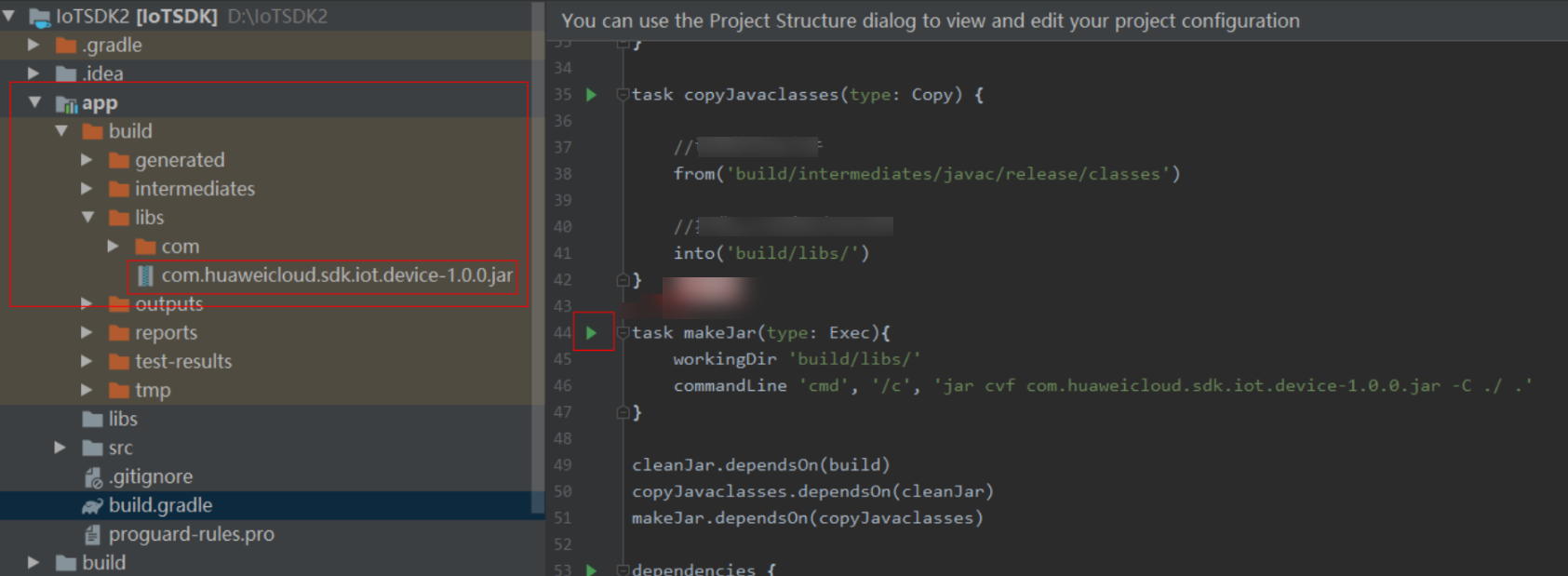 - After the Android project is configured, run task makeJar in the build.gradle file (ensure that the Java environment variable has been added) to generate a JAR package.