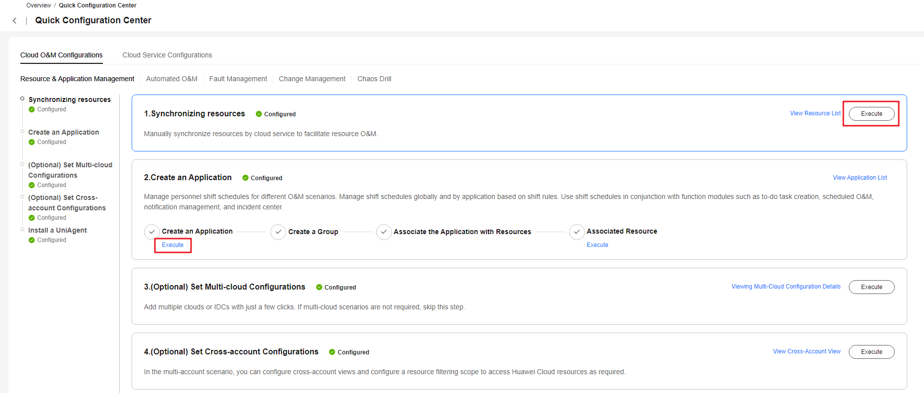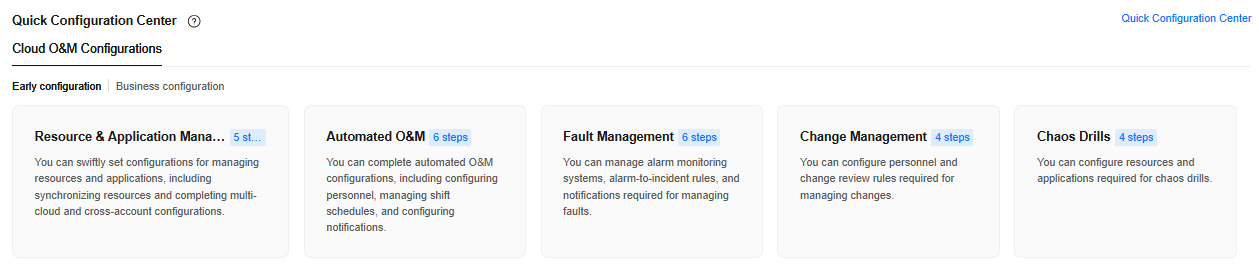 - Early configuration encompasses five features: resource and application management, automated O&M, fault management, change ticket management, and chaos drills. You can complete configurations by service scenario as required.