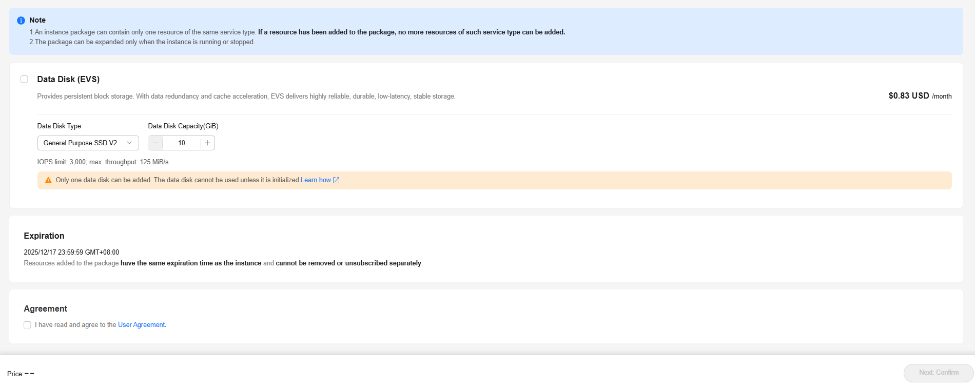 - The added data disk must be manually initialized in the cloud server OS before you can use it. For details about how to initialize a data disk, see Initializing a Data Disk.