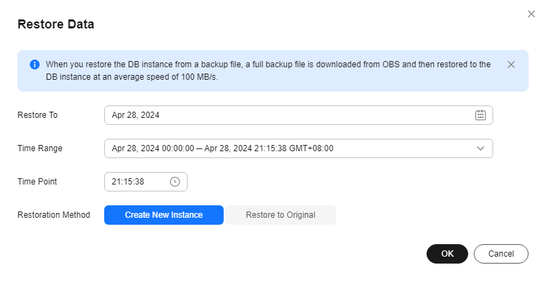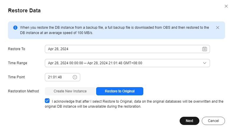 When you enter the time point that you want to restore the DB instance to, FlexusRDS downloads the most recent full backup file from OBS to the DB instance. Then, incremental backups are also restored to the specified point in time on the DB instance. Data is restored at an average speed of 100 MB/s.