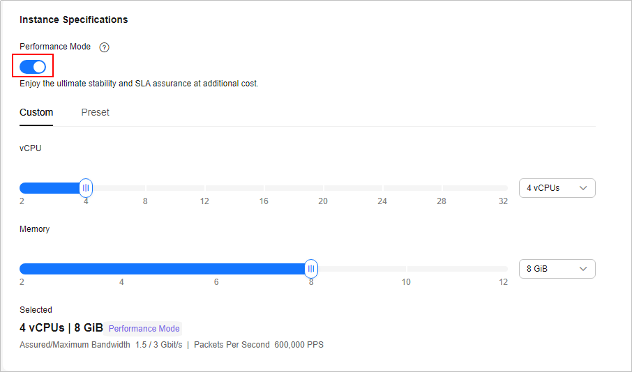 El modo de rendimiento solo está disponible en algunas regiones. Para obtener más detalles, véase la información que se muestra en la consola de gestión.