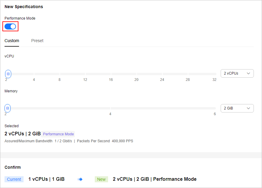 Puede habilitar el modo de rendimiento para la instancia mediante la opción Modify Specifications. Durante este proceso, es posible que también deba modificar las especificaciones de la instancia si los recursos subyacentes son insuficientes. Para obtener más información sobre cómo modificar las especificaciones, véase Modificación de las especificaciones de una instancia de FlexusX.