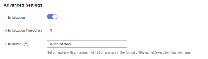 - Establezca el inicializador de la misma manera que el manejador. Por ejemplo, para una función Node.js o Python, establezca un nombre de inicializador en el formato de [file name].[initialization function name].