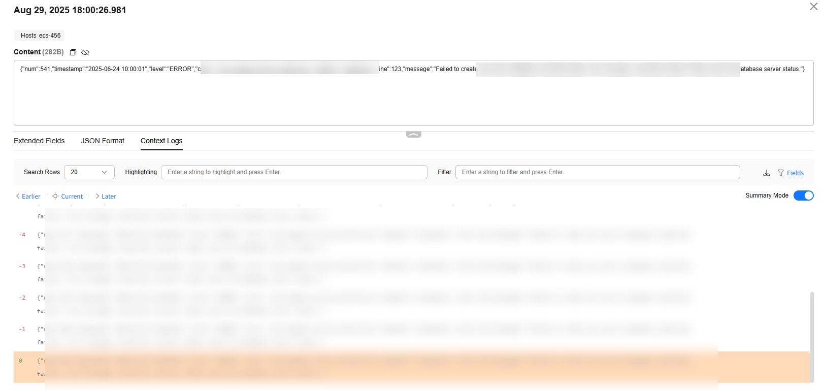 Viewing the context of a log is to find the preceding or following logs of the log in raw logs. This helps you quickly locate fault information by searching for logs generated before and after the specified log generation time to troubleshoot service faults.