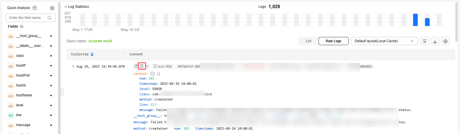 - On the Log Search tab page of the LTS console, you can quickly locate a fault by searching for suspicious logs in a specified time range and then query the context of the logs.