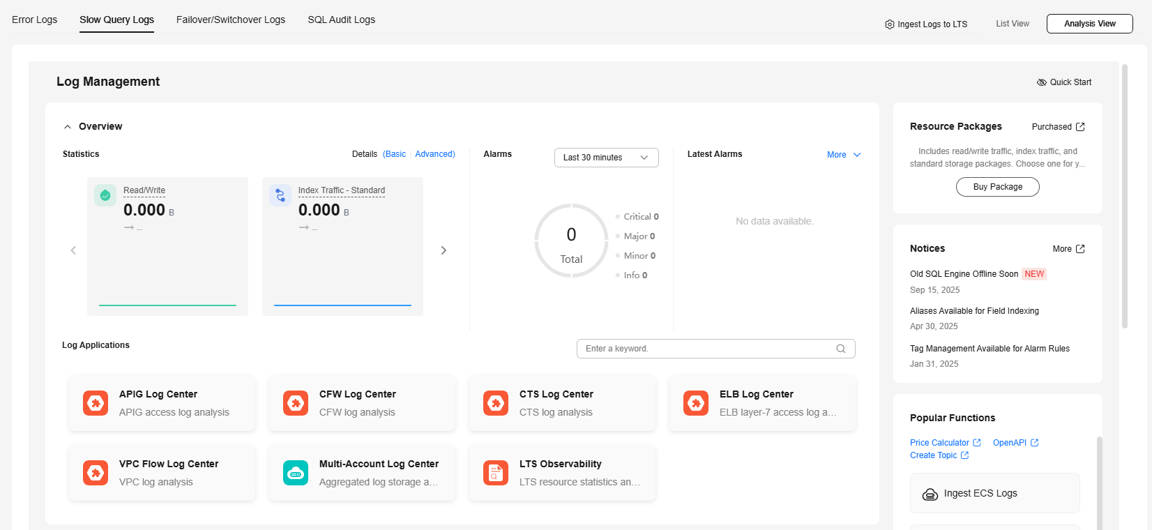 If Slow Log Ingestion to LTS is enabled, you can switch to the analysis view in the upper right corner of the page to see more details. For more information, see Managing Log Groups.Figure 4 Analysis view