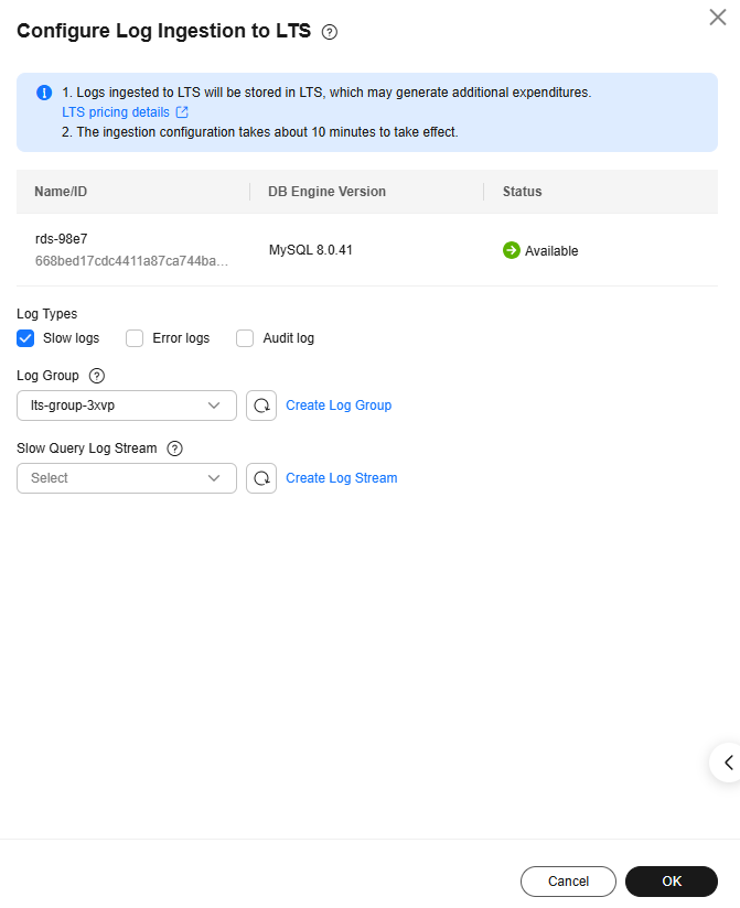 - In the displayed dialog box, select Slow logs under Log Types, select a log group and log stream, and click OK.
