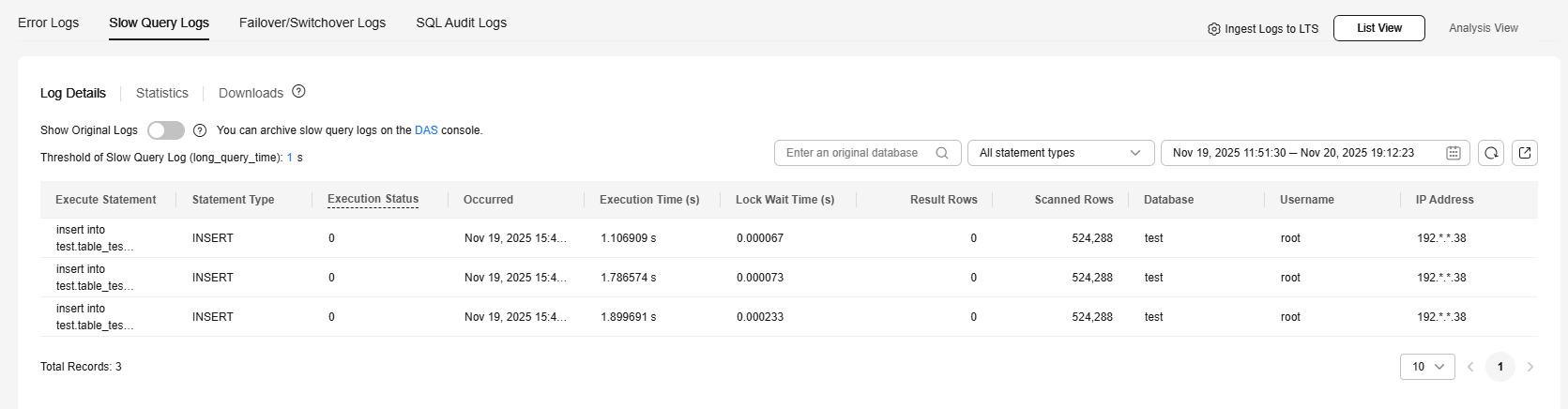 Slow query logs record statements that exceed the long_query_time value (1 second by default). You can view log details and statistics to identify statements that are executing slowly and optimize the statements. You can also download slow query logs for service analysis.