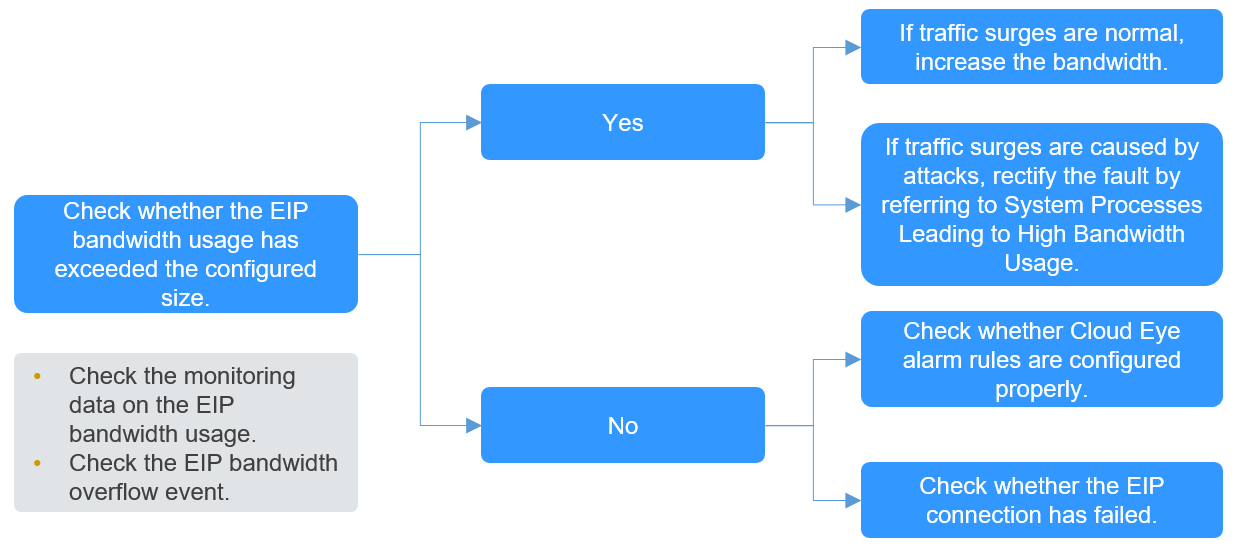 - Check the alarm rule settings and EIP connectivity if the bandwidth usage has not exceeded the configured limit.