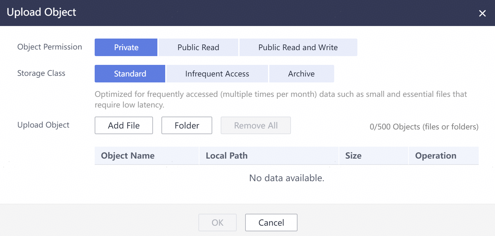 Upload local files or folders to OBS. If you do not specify a storage class during file or folder upload, any file or folder you upload will inherit the storage class of the bucket by default.