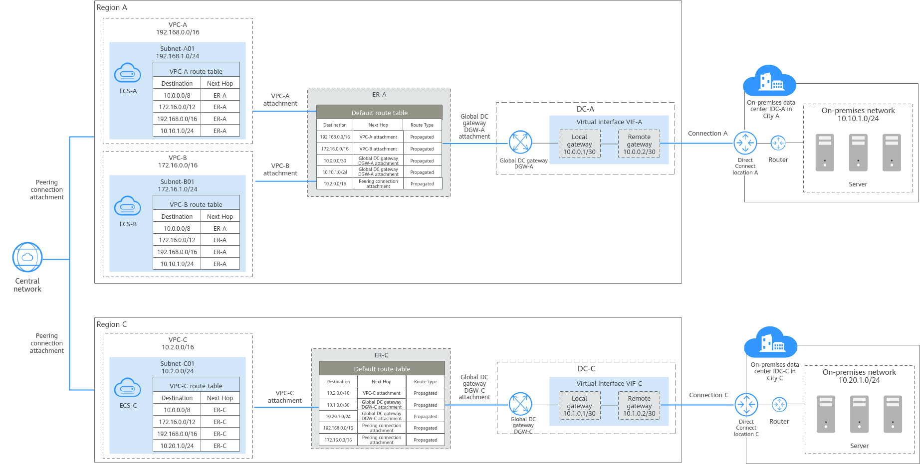 You can attach VPCs and Direct Connect global DC gateways in the same region to an enterprise router, and then add the enterprise routers in different regions to a central network. In this way, VPCs in different regions can communicate with on-premises data centers in multiple cities. Compared with a cloud connection, using a central network features a simpler architecture and higher scalability.