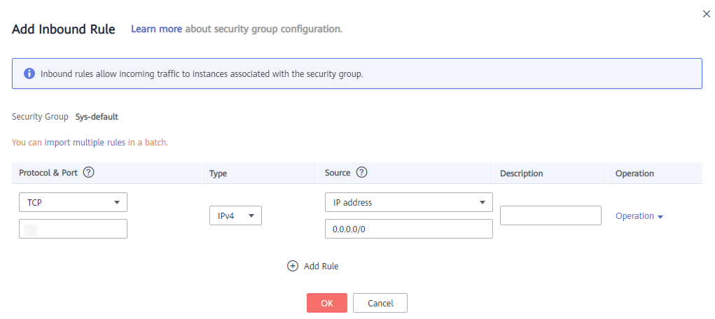 • There is no need to configure security rules for the ECS because the default security group rule of the ECS allows all outbound data packets. If not all outbound traffic is allowed in the security group, configure an outbound rule for the ECS. For details, see Configuring a Security Group Rule.