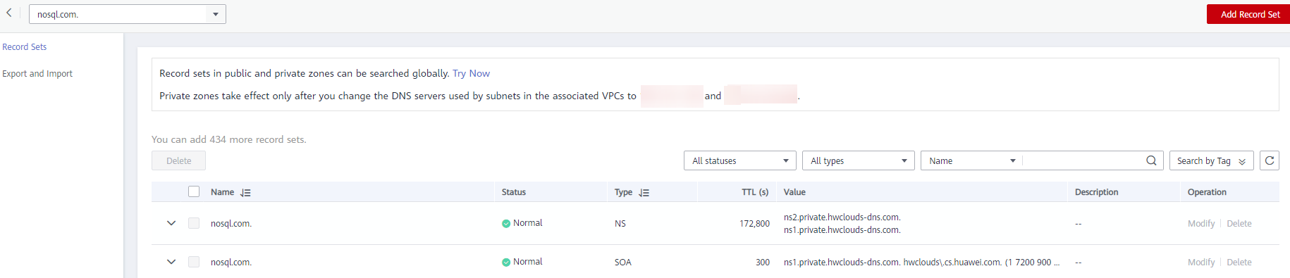 - Click the private domain name you created. On the displayed page, click Add Record Set in the upper right corner.