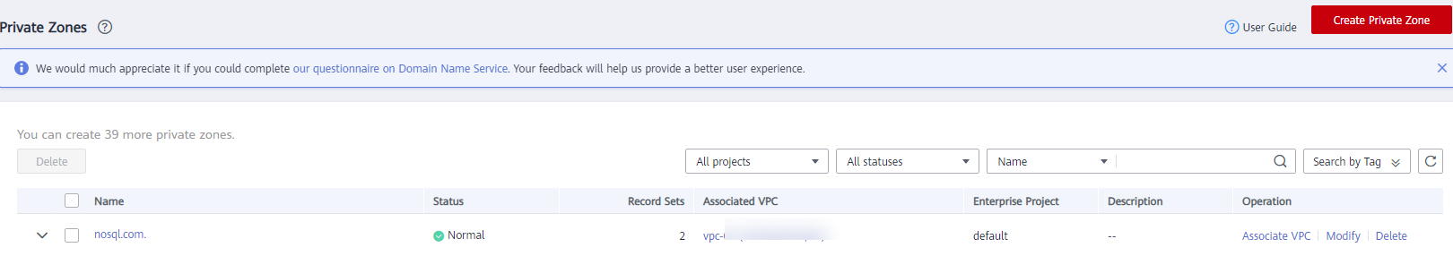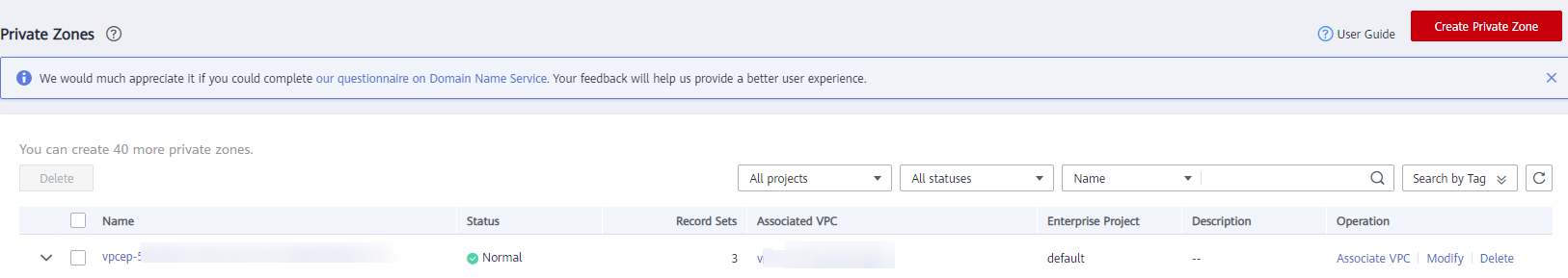 - Click OK. On the Private Zones page, view the created private domain name in the zone list.