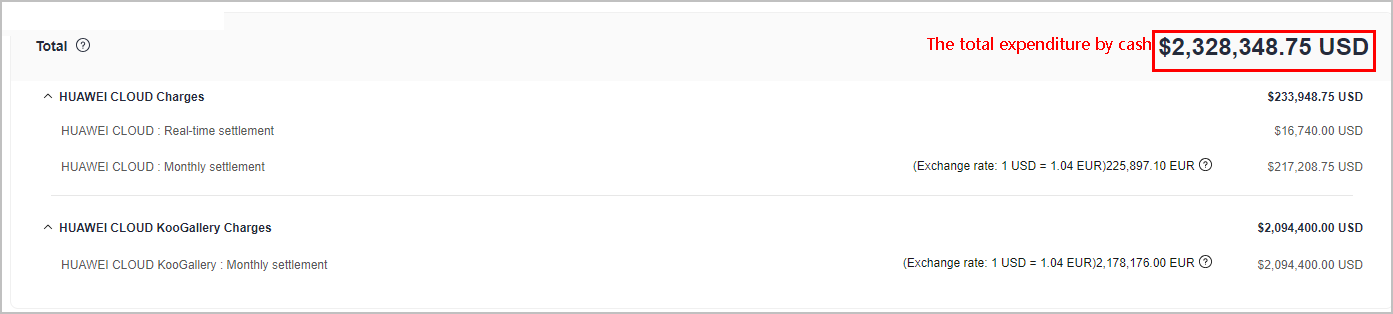 Figure 1 Total- Real-time settlement fees: Fees paid in cash, for example, through an online payment. The fees may be paid for purchases, renewals, or specification upgrades of yearly/monthly resources, or purchases of reserved instances.