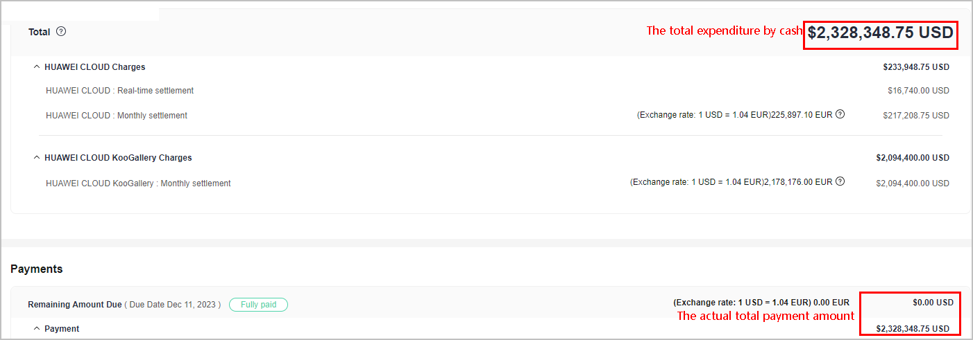 You can view the total cash expenditure (including the monthly settlement amount) in the monthly bill and the total payment amount on the Billing > Bills page.