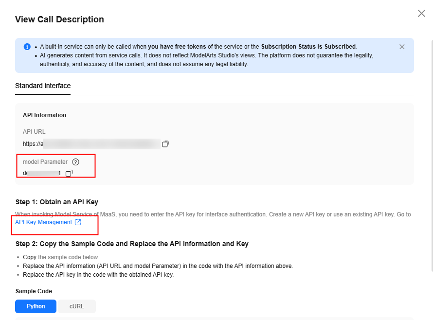 - API Key: When invoking Model Service of MaaS, you need to enter the API key for interface authentication. You can create and obtain the API key by referring to Step 1 on the View Call Description > Version > Standard interface tab page of the Real-Time Inference page on the MaaS (ModelArts Studio) platform.