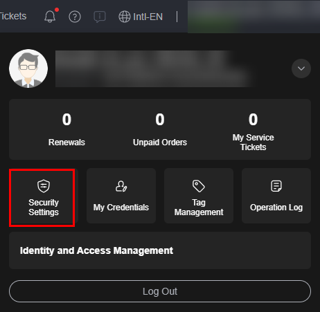 - On the management console, hover over the username in the upper right corner, and choose Security Settings from the drop-down list.