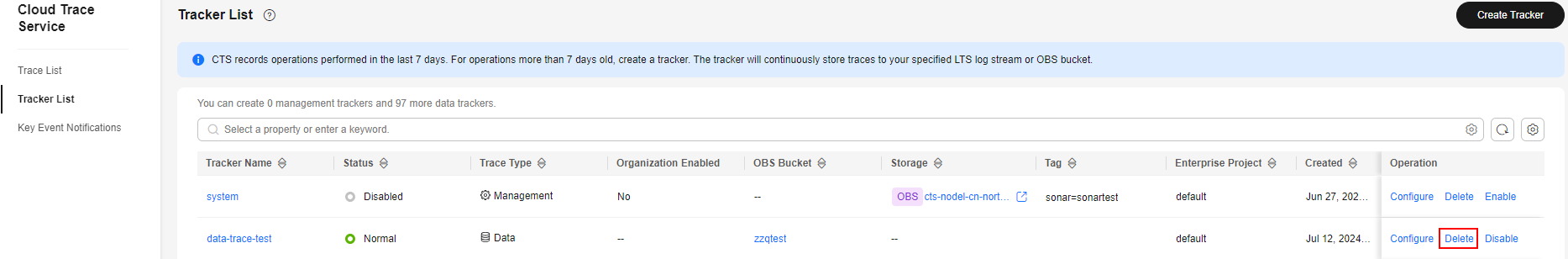 After a tracker is deleted, traces can still be reported to CTS. You can view traces of the last seven days in the trace list. However, new traces recorded after you disable the tracker cannot be viewed and transferred to OBS or LTS, and key event notifications will not be sent.