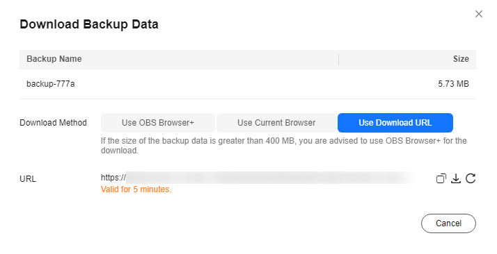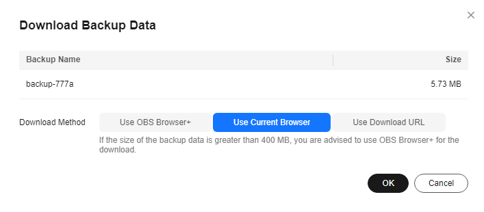 - If the size of the backup data is greater than 400 MB, you are advised to use OBS Browser+ to download the backup data.