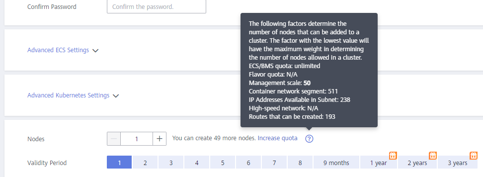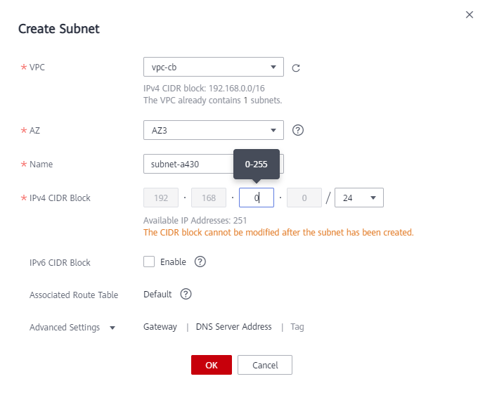 Você pode selecionar uma nova sub-rede ao criar um nó do CCE. A nova sub-rede tem um máximo de 251 endereços IP privados. Se o número de endereços IP privados não puder atender aos requisitos de serviço, você poderá adicionar mais sub-redes.