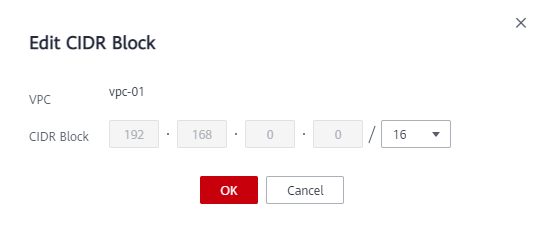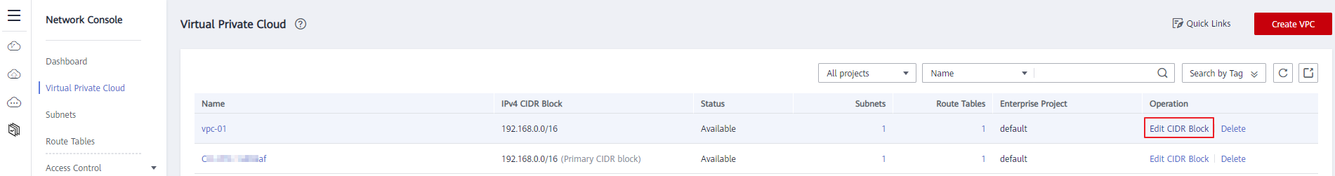Faça logon no console e escolha Virtual Private Cloud na lista de serviços. Clique em Edit CIDR Block na coluna Operation da VPC de destino.