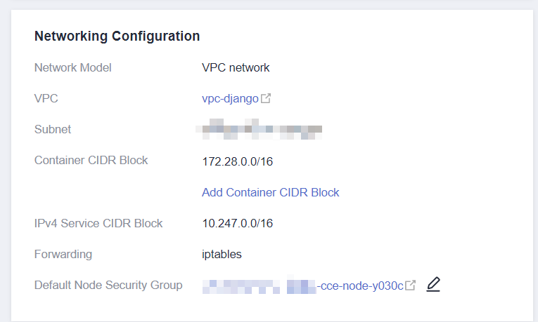 Você pode clicar no nome do cluster para exibir os detalhes do cluster. Na área Networking Configuration, clique no ícone ao lado de Default security group of the node para verificar se o grupo de segurança padrão é excluído e se as regras do grupo de segurança estão em conformidade com o Configuração de regras do grupo de segurança do cluster.