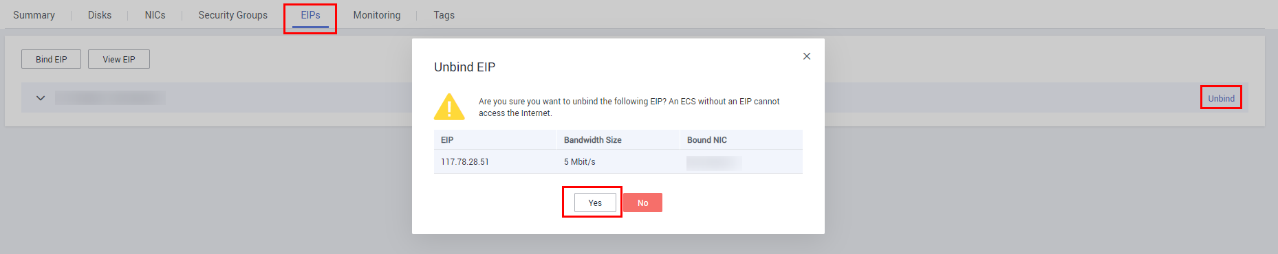 - Na página de detalhes do ECS, clique na guia EIPs. Na lista EIP, clique em Unbind na linha do ECS de destino e clique em Yes.