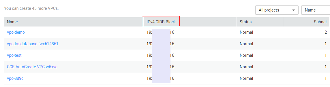 Na página inicial do console da VPC, visualize o Name/ID e CIDR Block de VPCs. Você pode modificar o bloco CIDR de uma VPC ou recriar uma VPC.