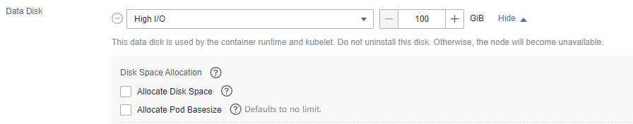 - Allocate Pod Basesize: o CCE permite que você defina um limite superior para o espaço em disco ocupado por cada pod de carga de trabalho (incluindo o espaço ocupado por imagens de contêiner). Essa configuração impede que os pods ocupem todo o espaço em disco disponível, o que pode causar exceções de serviço. Recomenda-se que o valor seja menor ou igual a 80% do espaço do motor do contêiner.