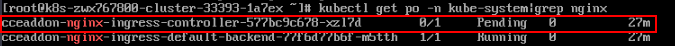 No entanto, depois que o complemento nginx-ingress for instalado, o complemento estará sempre no estado Creating e o nginx-ingress-controller estará sempre no estado Pending.