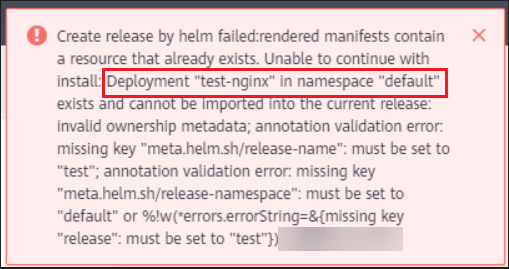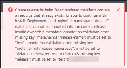 Quando uma versão não pode ser criada ou atualizada, a mensagem de erro "Create release by helm failed:rendered manifests contain a resource that already exists" é exibida. Não é possível continuar com a instalação: ..., label validation error:missing key \"app.kubernetes.io/managed-by\":must be set to\"Helm\" ... Falhou ao criar o release.
