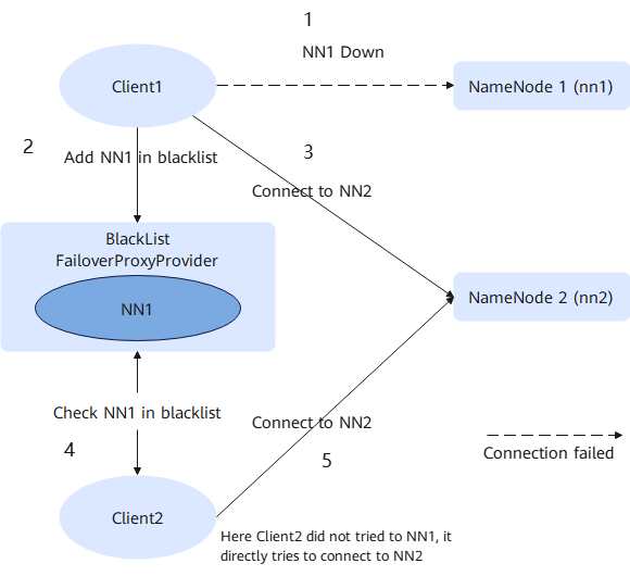 In this case, when client1 attempts to connect to nn1 (active) that is faulty, nn1 is added to the blacklist. Other clients then connect to nn2 instead of nn1.
